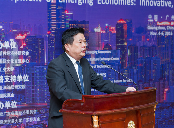 11月5日,2016新兴经济体论坛(国际学术会议)在广州举行,主题是“新兴经济体发展:创新、活力、联动、包容”。中共中央对外联络部原副部长于洪君,巴西联邦共和国参议院参议员、原总统候选人C?布瓦尔克,省政府外事办公室副主任李坚、校长陈新教授,中国新兴经济体研究会会长、中国社会科学院世界经济与政治研究所所长张宇燕研究员为论坛致辞。会议分主题报告和专题论坛举办。